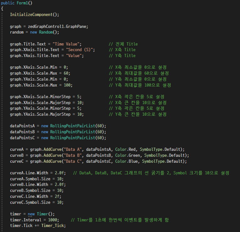 여기서 계속 나오는 zedGraphControl1.AxisChange와 Refresh가 있는데,